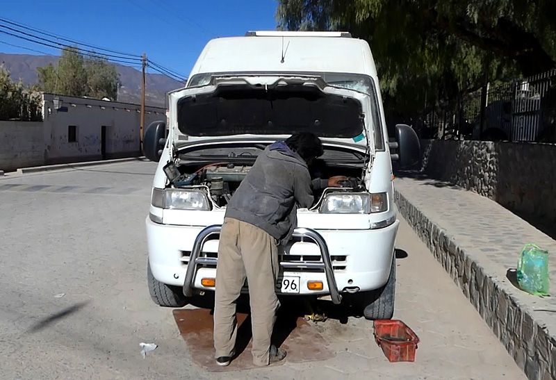 We are now on the road for 20 years and it is not the first time one of our two motorhomes has a severe problem. But as always help is nearby. Nelson, one of the few mechanics in Cachi, lives right on the corner where we broke down and somehow he manages to get the clutch connected again after 2 days and one long night of hard work. Amazing!
